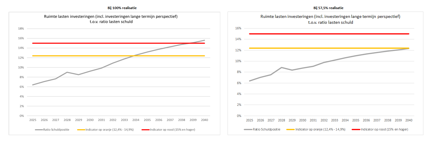 Binnen de programmabegroting hanteren we een afslag op de kapitaallasten van 42,5% omdat we meer investeringen ramen dan we daadwerkelijk kunnen realiseren. We laten daarom in onderstaande grafieken het verloop van de drie indicatoren zien bij een volledige investeringsraming (100%, grafiek links) en bij een realisatiegraad van 57,5% (grafiek rechts).