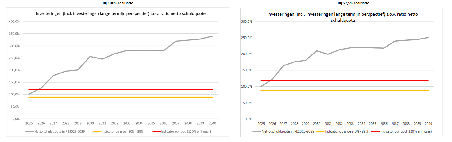 De indicator netto schuldquote schiet in beide gevallen, zowel bij 100% investeringen als bij 57,5%, al in 2027 in het rood.