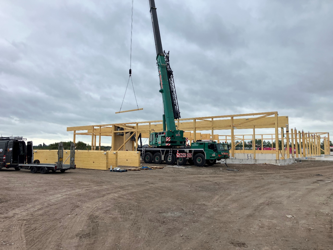 De bouw is inmiddels in volle gang; de betonnen onderbouw is gereed en er is begonnen met het realiseren van de houtconstructie (zie foto) waarop de houtskeletdelen zullen worden bevestigd. Onze aannemer ligt daarmee met de bouw op planning.